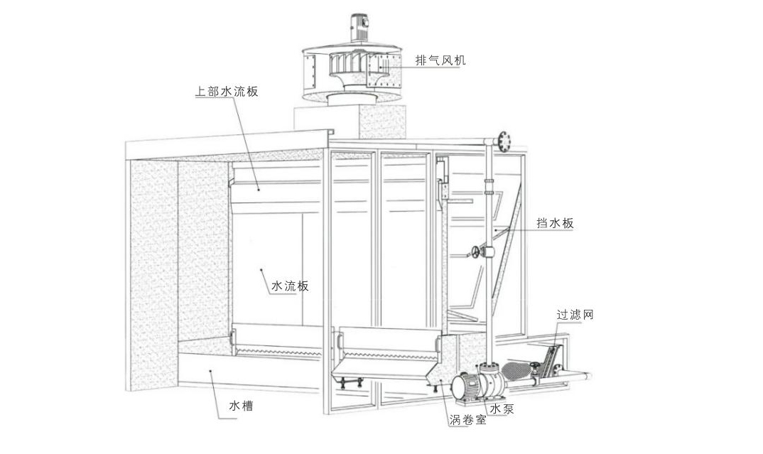 環(huán)保型水幕柜主要是由自吸水泵循環(huán)抽水往水簾板上均勻的流下來,使噴槍噴出來的漆霧和打磨產(chǎn)生的大顆粒粉塵被水簾板上的水打到下面水池里。再有少部分細(xì)微的漆霧和粉塵顆粒被末端的風(fēng)機引入高效過濾器,通過排風(fēng)管道排出車間外面或進行高空排放。